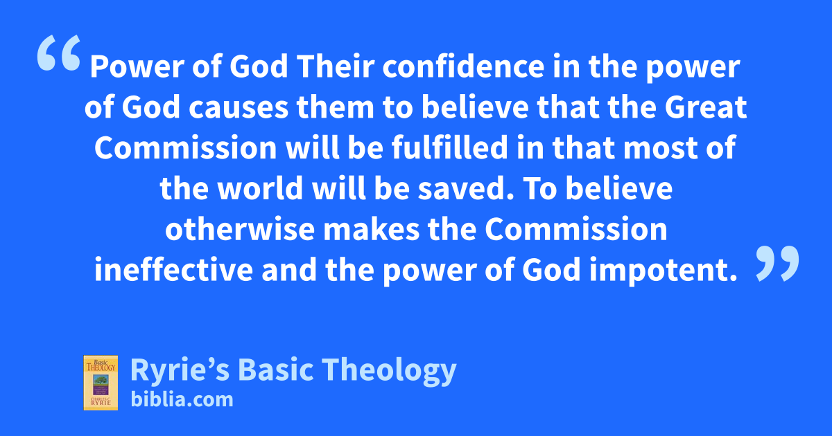 Power of God Their confidence in the power of God causes them to believe that the Great Commission will be fulfilled in that most of the world will be saved. To believe otherwise makes the Commission ineffective and the power of God impotent.