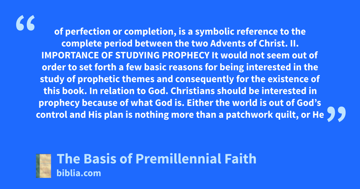 of perfection or completion, is a symbolic reference to the complete period between the two Advents of Christ. II. IMPORTANCE OF STUDYING PROPHECY It would not seem out of order to set forth a few basic reasons for being interested in the study of prophetic themes and consequently for the existence of this book. In relation to God. Christians should be interested in prophecy because of what God is. Either the world is out of God’s control and His plan is nothing more than a patchwork quilt, or He