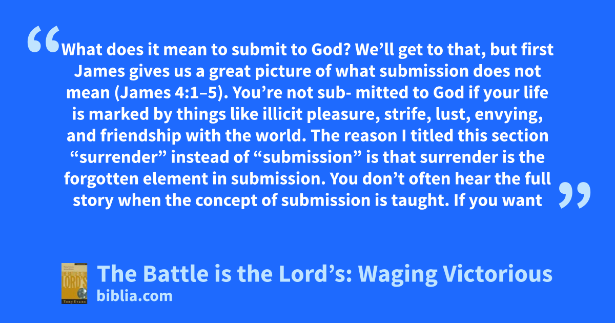 What does it mean to submit to God? We’ll get to that, but first James gives us a great picture of what submission does not mean (James 4:1–5). You’re not sub- mitted to God if your life is marked by things like illicit pleasure, strife, lust, envying, and friendship with the world. The reason I titled this section “surrender” instead of “submission” is that surrender is the forgotten element in submission. You don’t often hear the full story when the concept of submission is taught. If you want
