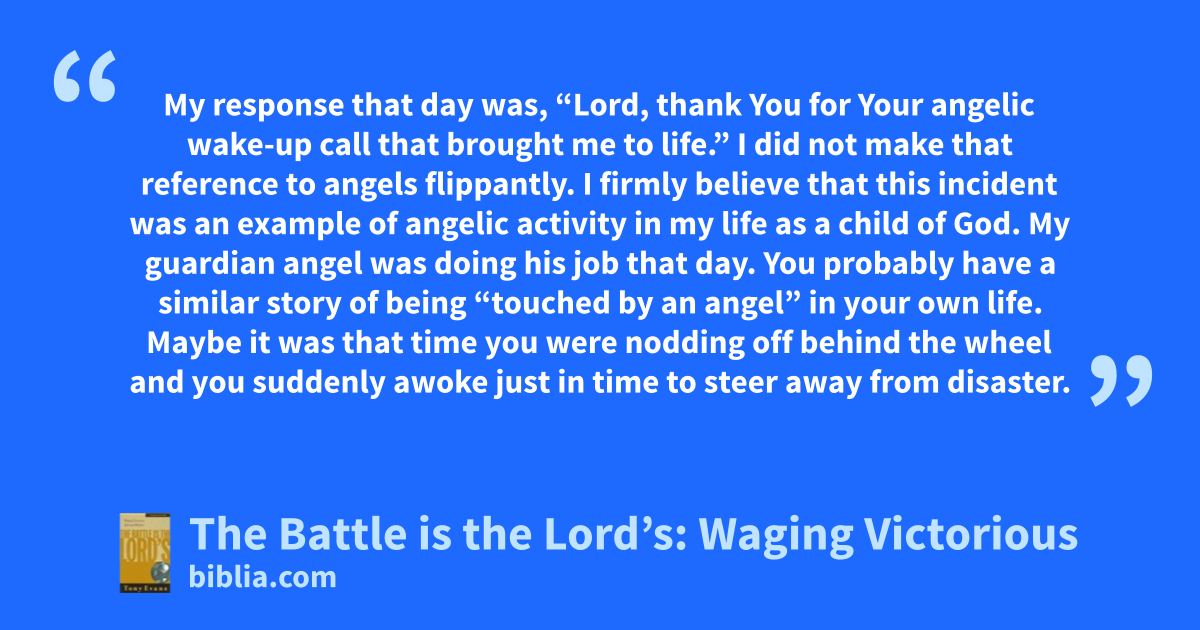 My response that day was, “Lord, thank You for Your angelic wake-up call that brought me to life.” I did not make that reference to angels flippantly. I firmly believe that this incident was an example of angelic activity in my life as a child of God. My guardian angel was doing his job that day. You probably have a similar story of being “touched by an angel” in your own life. Maybe it was that time you were nodding off behind the wheel and you suddenly awoke just in time to steer away from disaster.