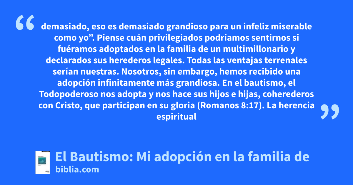 demasiado, eso es demasiado grandioso para un infeliz miserable como yo”. Piense cuán privilegiados podríamos sentirnos si fuéramos adoptados en la familia de un multimillonario y declarados sus herederos legales. Todas las ventajas terrenales serían nuestras. Nosotros, sin embargo, hemos recibido una adopción infinitamente más grandiosa. En el bautismo, el Todopoderoso nos adopta y nos hace sus hijos e hijas, coherederos con Cristo, que participan en su gloria (Romanos 8:17). La herencia espiritual