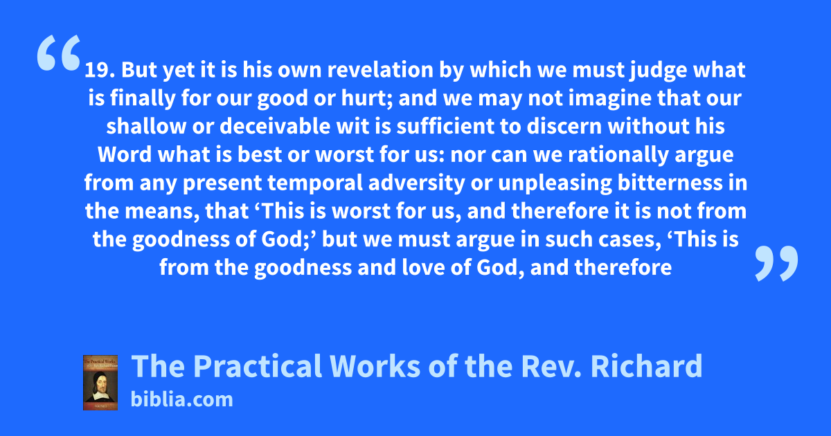 19. But yet it is his own revelation by which we must judge what is finally for our good or hurt; and we may not imagine that our shallow or deceivable wit is sufficient to discern without his Word what is best or worst for us: nor can we rationally argue from any present temporal adversity or unpleasing bitterness in the means, that ‘This is worst for us, and therefore it is not from the goodness of God;’ but we must argue in such cases, ‘This is from the goodness and love of God, and therefore
