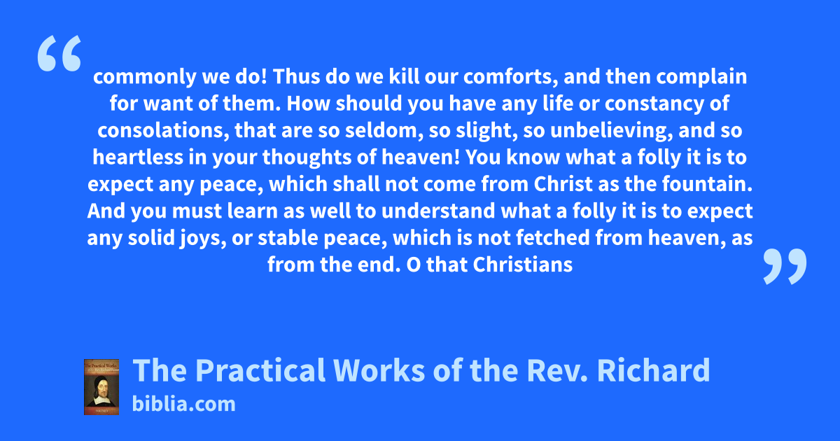 commonly we do! Thus do we kill our comforts, and then complain for want of them. How should you have any life or constancy of consolations, that are so seldom, so slight, so unbelieving, and so heartless in your thoughts of heaven! You know what a folly it is to expect any peace, which shall not come from Christ as the fountain. And you must learn as well to understand what a folly it is to expect any solid joys, or stable peace, which is not fetched from heaven, as from the end. O that Christians