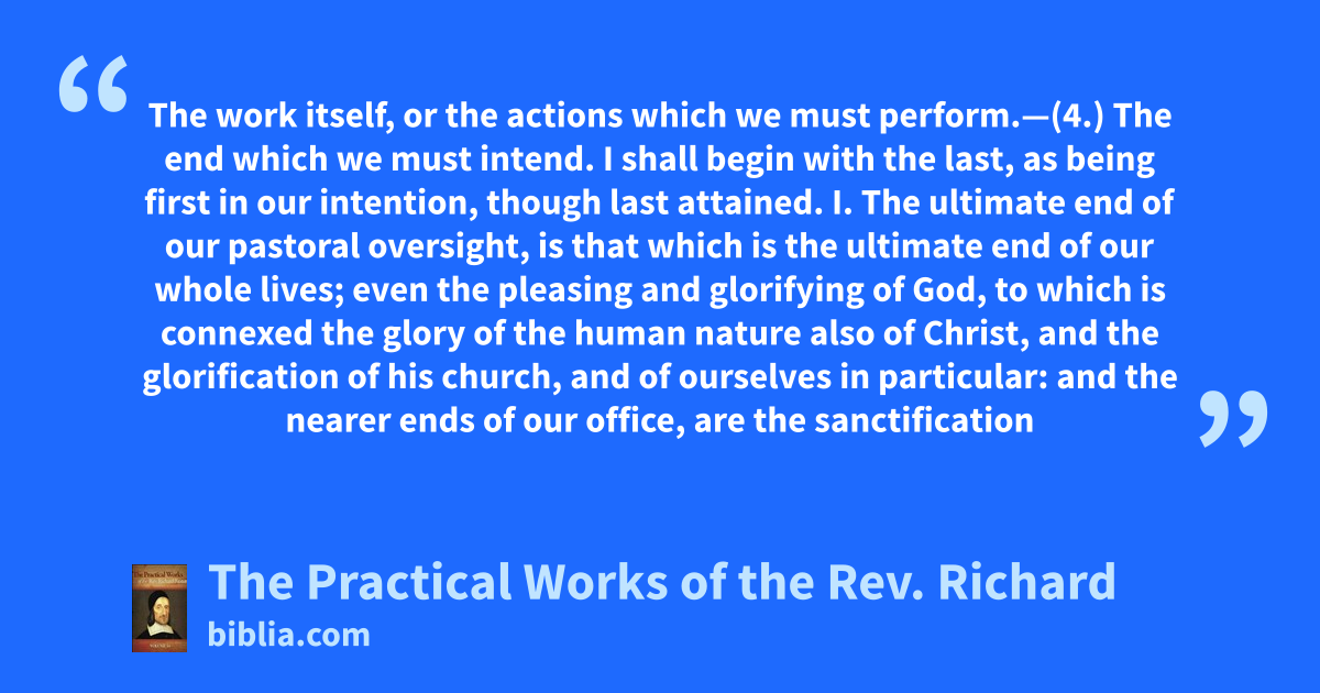 The work itself, or the actions which we must perform.—(4.) The end which we must intend. I shall begin with the last, as being first in our intention, though last attained. I. The ultimate end of our pastoral oversight, is that which is the ultimate end of our whole lives; even the pleasing and glorifying of God, to which is connexed the glory of the human nature also of Christ, and the glorification of his church, and of ourselves in particular: and the nearer ends of our office, are the sanctification