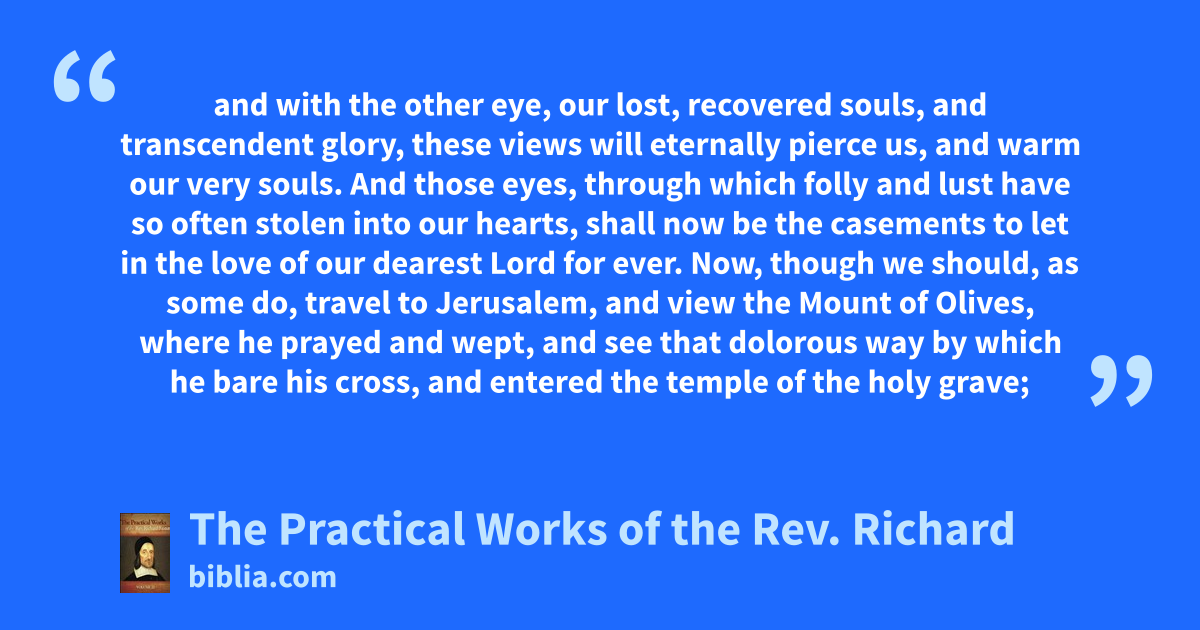 and with the other eye, our lost, recovered souls, and transcendent glory, these views will eternally pierce us, and warm our very souls. And those eyes, through which folly and lust have so often stolen into our hearts, shall now be the casements to let in the love of our dearest Lord for ever. Now, though we should, as some do, travel to Jerusalem, and view the Mount of Olives, where he prayed and wept, and see that dolorous way by which he bare his cross, and entered the temple of the holy grave;