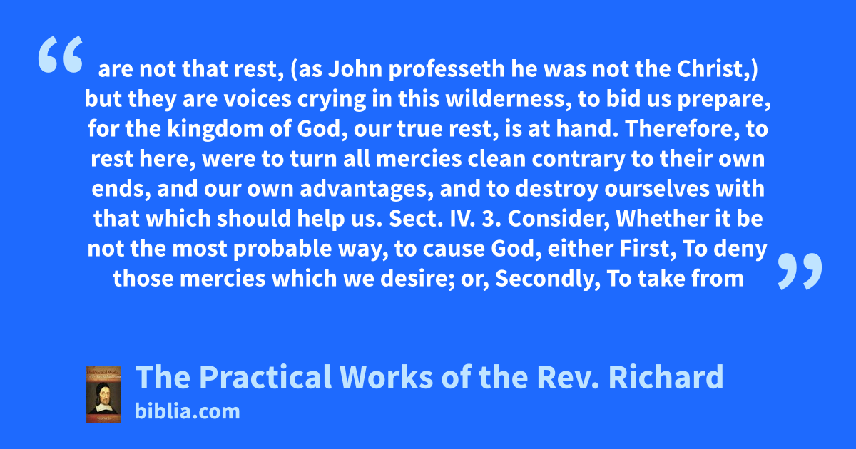 are not that rest, (as John professeth he was not the Christ,) but they are voices crying in this wilderness, to bid us prepare, for the kingdom of God, our true rest, is at hand. Therefore, to rest here, were to turn all mercies clean contrary to their own ends, and our own advantages, and to destroy ourselves with that which should help us. Sect. IV. 3. Consider, Whether it be not the most probable way, to cause God, either First, To deny those mercies which we desire; or, Secondly, To take from