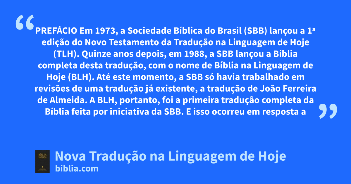 Está aí, portanto, para o uso das igrejas, para o uso individual, familiar e geral, a Nova Tradução na Linguagem de Hoje. Sendo a expressão da Palavra de Deus na linguagem simples do povo, a Comissão de Tradução da SBB pede a Deus e deseja que muitos a recebam com alegria e tenham em sua vida a experiência do salmista: “A tua palavra é lâmpada para guiar os meus passos, é luz que ilumina o meu caminho” (Salmo 119:105). E Deus conceda também que muitos a utilizem em suas atividades de adoração, evangelização, educação e pregação, “como a espada que o Espírito Santo lhes dá” (Efésios 6:17).