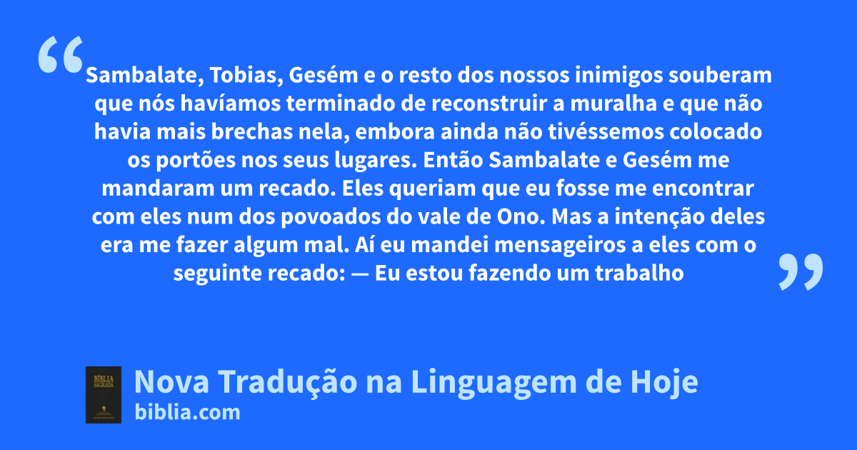 1 Sambalate, Tobias, Gesém e o resto dos nossos inimigos souberam que nós havíamos terminado de reconstruir a muralha e que não havia mais brechas nela, embora ainda não tivéssemos colocado os portões nos seus lugares. 2 Então Sambalate e Gesém me mandaram um recado. Eles queriam que eu fosse me encontrar com eles num dos povoados do vale de Ono. Mas a intenção deles era me fazer algum mal. 3 Aí eu mandei mensageiros a eles com o seguinte recado: