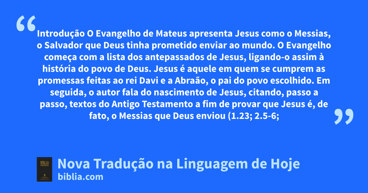 O Evangelho de Mateus apresenta Jesus como o Messias, o Salvador que Deus tinha prometido enviar ao mundo. O Evangelho começa com a lista dos antepassados de Jesus, ligando-o assim à história do povo de Deus. Jesus é aquele em quem se cumprem as promessas feitas ao rei Davi e a Abraão, o pai do povo escolhido. Em seguida, o autor fala do nascimento de Jesus, citando, passo a passo, textos do Antigo Testamento a fim de provar que Jesus é, de fato, o Messias que Deus enviou (1.23; 2.5-6; 2.15; 2.17-18; 2.23).
