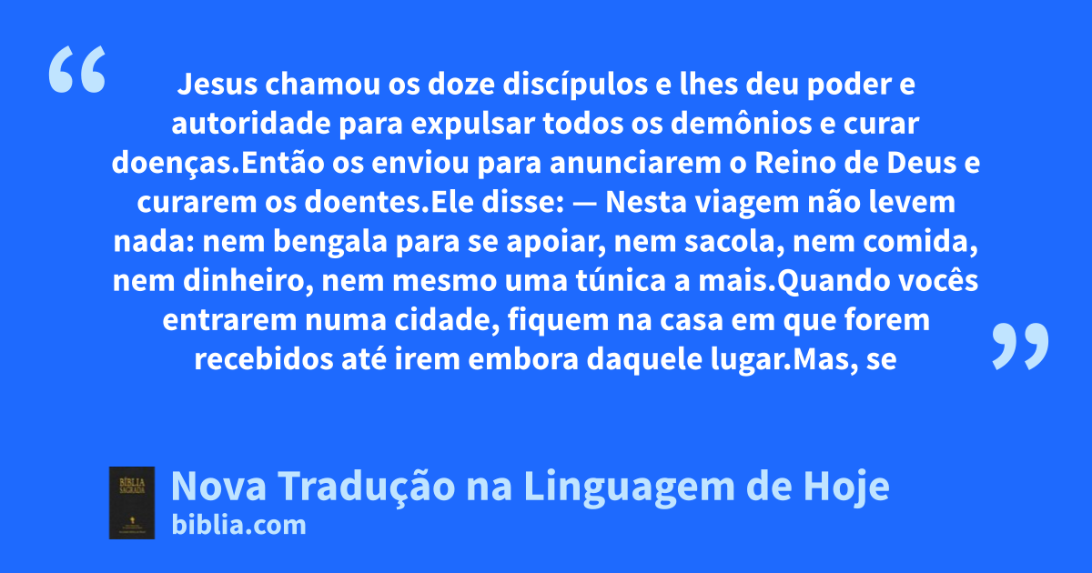 1 Jesus chamou os doze discípulos e lhes deu poder e autoridade para expulsar todos os demônios e curar doenças.2 Então os enviou para anunciarem o * Reino de Deus e curarem os doentes.3 Ele disse:
