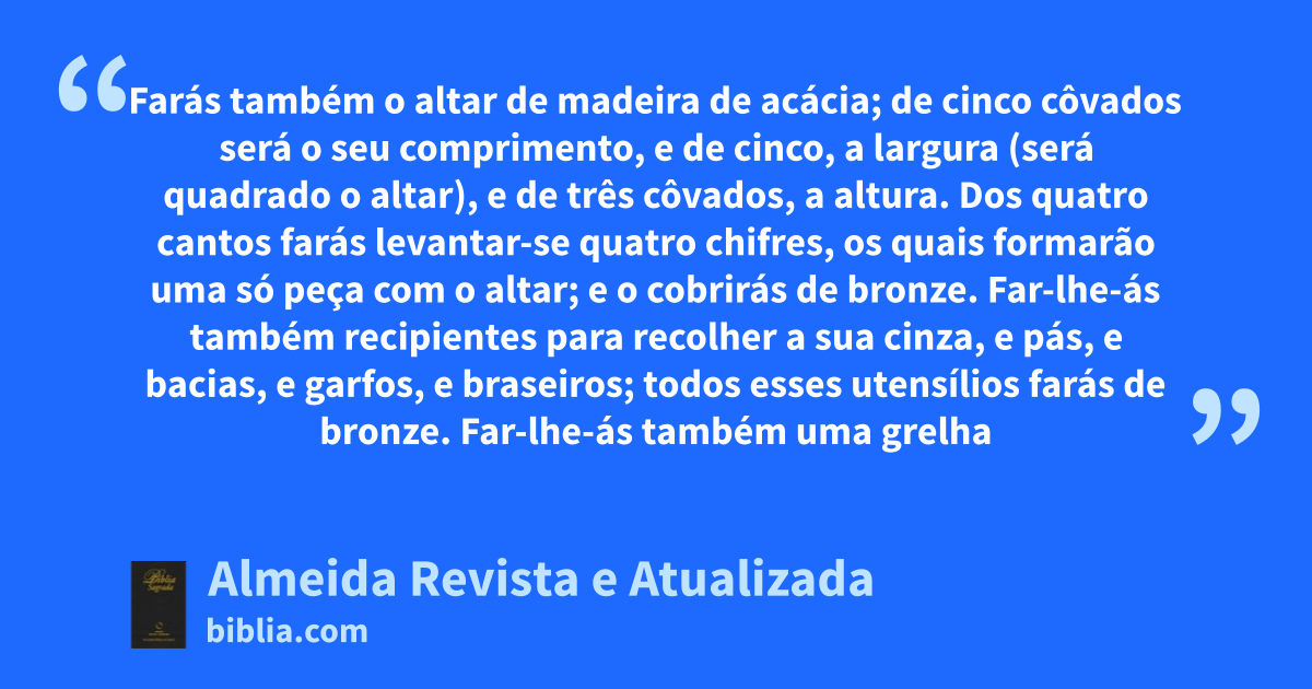 27 1 Farás também o altar de madeira de acácia; de cinco côvados será o seu comprimento, e de cinco, a largura (será quadrado o altar), e de três côvados, a altura. 2 Dos quatro cantos farás levantar-se quatro chifres, os quais formarão uma só peça com o altar; e o cobrirás de bronze. 3 Far-lhe-ás também recipientes para recolher a sua cinza, e pás, e bacias, e garfos, e braseiros; todos esses utensílios farás de bronze. 4 Far-lhe-ás também uma grelha de bronze em forma de rede, à qual farás quatro argolas de metal nos seus quatro cantos, 5 e as porás dentro do rebordo do altar para baixo, de maneira que a rede chegue até ao meio do altar. 6 Farás também varais para o altar, varais de madeira de acácia, e os cobrirás de bronze. 7 Os varais se meterão nas argolas, de um e de outro lado do altar, quando for levado. 8 Oco e de tábuas o farás; como se te mostrou no monte, assim o farão.