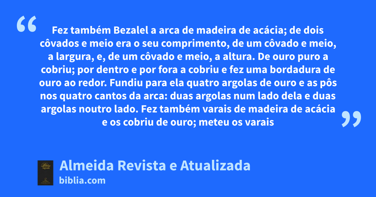 37 1 Fez também Bezalel a arca de madeira de acácia; de dois côvados e meio era o seu comprimento, de um côvado e meio, a largura, e, de um côvado e meio, a altura. 2 De ouro puro a cobriu; por dentro e por fora a cobriu e fez uma bordadura de ouro ao redor. 3 Fundiu para ela quatro argolas de ouro e as pôs nos quatro cantos da arca: duas argolas num lado dela e duas argolas noutro lado. 4 Fez também varais de madeira de acácia e os cobriu de ouro; 5 meteu os varais nas argolas aos lados da arca, para se levar por meio deles a arca.