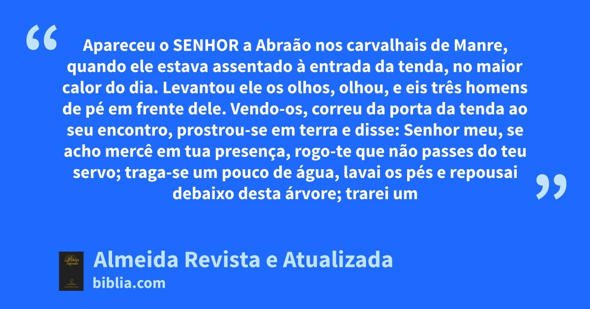 18 1 Apareceu o Senhor a Abraão nos carvalhais de Manre, quando ele estava assentado à entrada da tenda, no maior calor do dia. 2 Levantou ele os olhos, olhou, e eis três homens de pé em frente dele. Vendo-os, correu da porta da tenda ao seu encontro, prostrou-se em terra 3 e disse: Senhor meu, se acho mercê em tua presença, rogo-te que não passes do teu servo; 4 traga-se um pouco de água, lavai os pés e repousai debaixo desta árvore; 5 trarei um bocado de pão; refazei as vossas forças, visto que chegastes até vosso servo; depois, seguireis avante. Responderam: Faze como disseste. 6 Apressou-se, pois, Abraão para a tenda de Sara e lhe disse: Amassa depressa três medidas de flor de farinha e faze pão assado ao borralho. 7 Abraão, por sua vez, correu ao gado, tomou um novilho, tenro e bom, e deu-o ao criado, que se apressou em prepará-lo. 8 Tomou também coalhada e leite e o novilho que mandara preparar e pôs tudo diante deles; e permaneceu de pé junto a eles debaixo da árvore; e eles comeram.