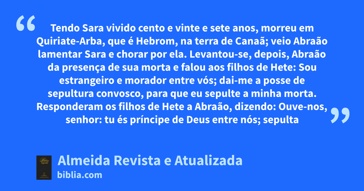 23 1 Tendo Sara vivido cento e vinte e sete anos, 2 morreu em Quiriate-Arba, que é Hebrom, na terra de Canaã; veio Abraão lamentar Sara e chorar por ela. 3 Levantou-se, depois, Abraão da presença de sua morta e falou aos filhos de Hete: 4 Sou estrangeiro e moradora entre vós; dai-me a posseb de sepultura convosco, para que eu sepulte a minha morta. 5 Responderam os filhos de Hete a Abraão, dizendo: 6 Ouve-nos, senhor: tu és príncipe de Deus entre nós; sepulta numa das nossas melhores sepulturas a tua morta; nenhum de nós te vedará a sua sepultura, para sepultares a tua morta. 7 Então, se levantou Abraão e se inclinou diante do povo da terra, diante dos filhos de Hete. 8 E lhes falou, dizendo: Se é do vosso agrado que eu sepulte a minha morta, ouvi-me e intercedei por mim junto a Efrom, filho de Zoar, 9 para que ele me dê a caverna de Macpela, que tem no extremo do seu campo; que ma dê pelo devido preço em posse de sepultura entre vós. 10 Ora, Efrom, o heteu, sentando-se no meio dos filhos de Hete, respondeu a Abraão, ouvindo-o os filhos de Hete, a saber, todos os que entravam pela porta da sua cidade: 11 De modo nenhum, meu senhor; ouve-me: dou-te o campo e também a caverna que nele está; na presença dos filhos do meu povo te dou; sepulta a tua morta. 12 Então, se inclinou Abraão diante do povo da terra; 13 e falou a Efrom, na presença do povo da terra, dizendo: Mas, se concordas, ouve-me, peço-te: darei o preço do campo, toma-o de mim, e sepultarei ali a minha morta. 14 Respondeu-lhe Efrom: 15 Meu senhor, ouve-me: um terreno que vale quatrocentos siclos de prata, que é isso entre mim e ti? Sepulta ali a tua morta. 16 Tendo Abraão ouvido isso a Efrom, pesou-lhe a prata, de que este lhe falara diante dos filhos de Hete, quatrocentos siclos de prata, moeda corrente entre os mercadores.