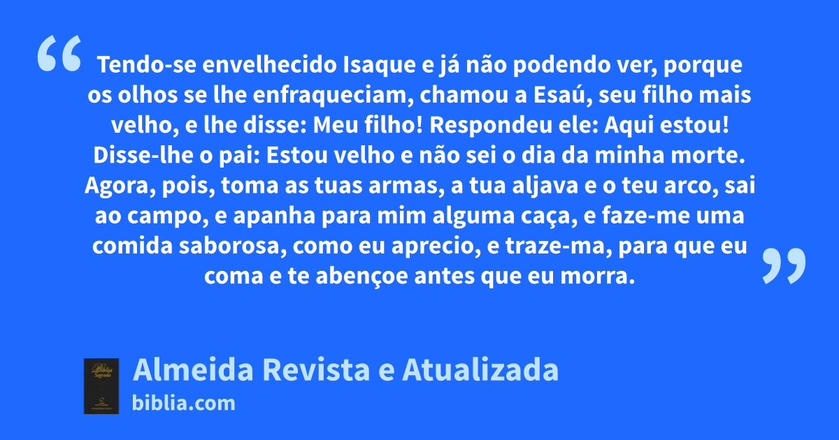 27 1 Tendo-se envelhecido Isaque e já não podendo ver, porque os olhos se lhe enfraqueciam, chamou a Esaú, seu filho mais velho, e lhe disse: Meu filho! Respondeu ele: Aqui estou! 2 Disse-lhe o pai: Estou velho e não sei o dia da minha morte. 3 Agora, pois, toma as tuas armas, a tua aljava e o teu arco, sai ao campo, e apanha para mim alguma caça, 4 e faze-me uma comida saborosa, como eu aprecio, e traze-ma, para que eu coma e te abençoe antes que eu morra. 5 Rebeca esteve escutando enquanto Isaque falava com Esaú, seu filho. E foi-se Esaú ao campo para apanhar a caça e trazê-la. 6 Então, disse Rebeca a Jacó, seu filho: Ouvi teu pai falar com Esaú, teu irmão, assim: 7 Traze caça e faze-me uma comida saborosa, para que eu coma e te abençoe diante do Senhor, antes que eu morra. 8 Agora, pois, meu filho, atende às minhas palavras com que te ordeno. 9 Vai ao rebanho e traze-me dois bons cabritos; deles farei uma saborosa comida para teu pai, como ele aprecia; 10 levá-la-ás a teu pai, para que a coma e te abençoe, antes que morra. 11 Disse Jacó a Rebeca, sua mãe: Esaú, meu irmão, é homem cabeludo, e eu, homem liso. 12 Dar-se-á o caso de meu pai me apalpar, e passarei a seus olhos por zombador; assim, trarei sobre mim maldição e não bênção. 13 Respondeu-lhe a mãe: Caia sobre mim essa maldição, meu filho; atende somente o que eu te digo, vai e traze-mos. 14 Ele foi, tomou-os e os trouxe a sua mãe, que fez uma saborosa comida, como o pai dele apreciava. 15 Depois, tomou Rebeca a melhor roupa de Esaú, seu filho mais velho, roupa que tinha consigo em casa, e vestiu a Jacó, seu filho mais novo. 16 Com a pele dos cabritos cobriu-lhe as mãos e a lisura do pescoço. 17 Então, entregou a Jacó, seu filho, a comida saborosa e o pão que havia preparado.