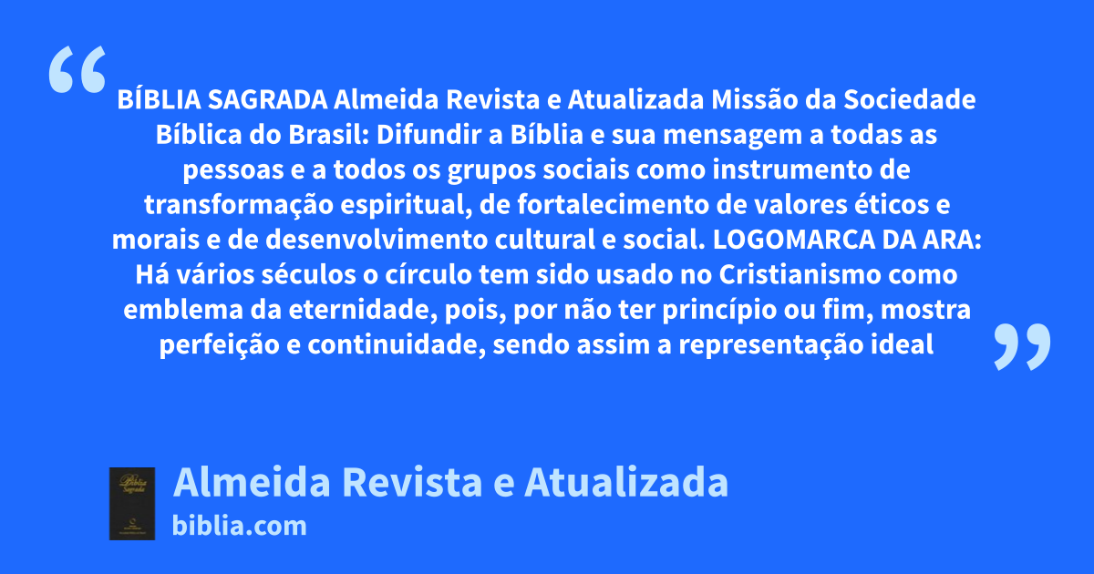 | LOGOMARCA DA ARA: Há vários séculos o círculo tem sido usado no Cristianismo como emblema da eternidade, pois, por não ter princípio ou fim, mostra perfeição e continuidade, sendo assim a representação ideal da vida eterna. Baseada nisso, a SBB adotou um círculo estilizado para identificar a edição Revista e Atualizada da tradução de João Ferreira de Almeida. |