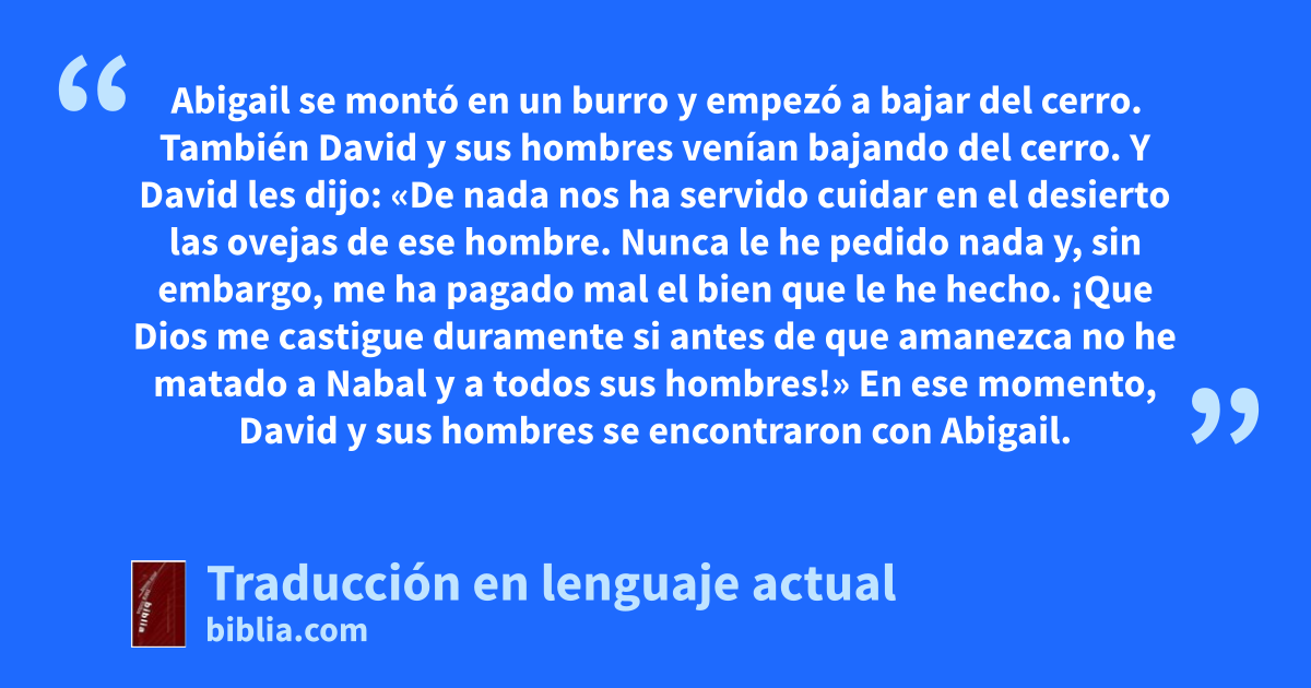Abigail se montó en un burro y empezó a bajar del cerro. También David y sus hombres venían bajando del cerro. Y David les dijo: «De nada nos ha servido cuidar en el desierto las ovejas de ese hombre. Nunca le he pedido nada y, sin embargo, me ha pagado mal el bien que le he hecho. ¡Que Dios me castigue duramente si antes de que amanezca no he matado a Nabal y a todos sus hombres!» En ese momento, David y sus hombres se encontraron con Abigail.