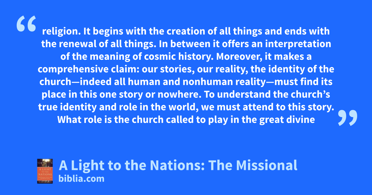 religion. It begins with the creation of all things and ends with the renewal of all things. In between it offers an interpretation of the meaning of cosmic history. Moreover, it makes a comprehensive claim: our stories, our reality, the identity of the church—indeed all human and nonhuman reality—must find its place in this one story or nowhere. To understand the church’s true identity and role in the world, we must attend to this story. What role is the church called to play in the great divine