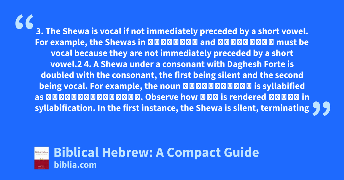 3. The Shewa is vocal if not immediately preceded by a short vowel. For example, the Shewas in בְּרָכָה and כֹּתְבִים must be vocal because they are not immediately preceded by a short vowel.2 4. A Shewa under a consonant with Daghesh Forte is doubled with the consonant, the first being silent and the second being vocal. For example, the noun הַמְּלָכִים is syllabified as הַמְ׀מְ׀לָ׀כִים. Observe how מְּ is rendered מְ׀מְ in syllabification. In the first instance, the Shewa is silent, terminating