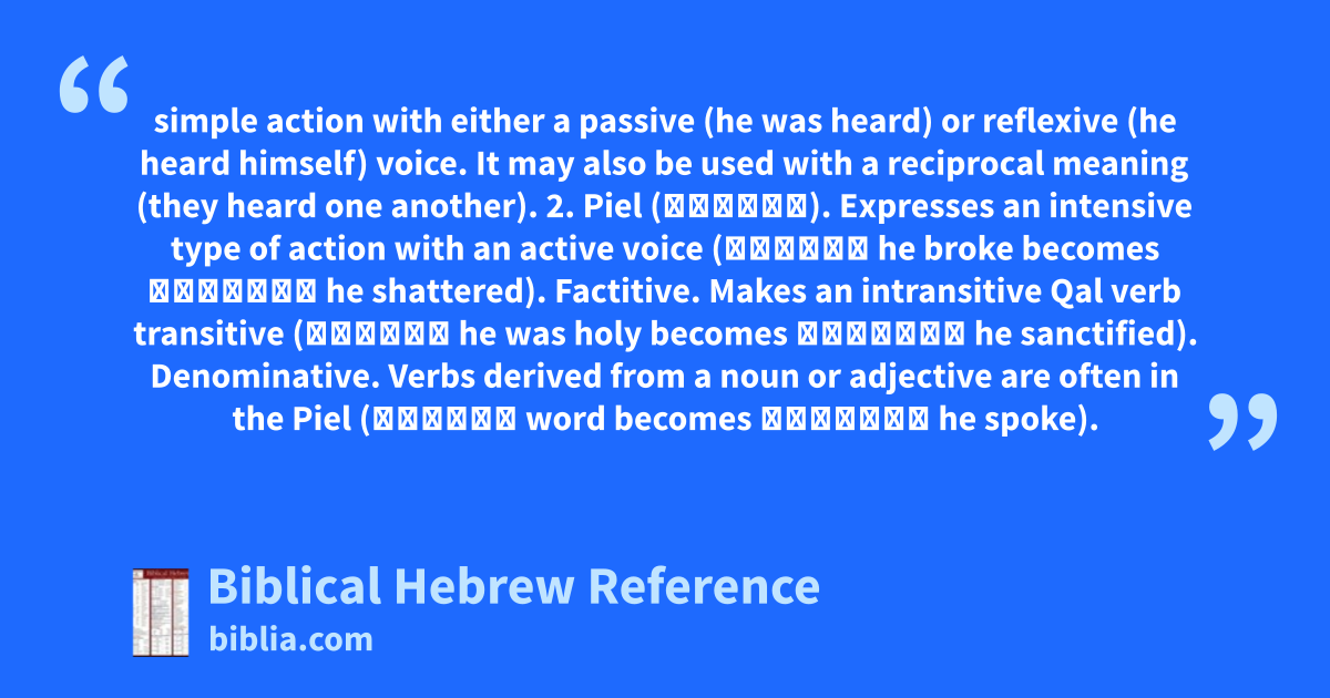 simple action with either a passive (he was heard) or reflexive (he heard himself) voice. It may also be used with a reciprocal meaning (they heard one another). 2. Piel (פִּעֵל). Expresses an intensive type of action with an active voice (שָׁבַר he broke becomes שִׁבֵּר he shattered). Factitive. Makes an intransitive Qal verb transitive (קָדַשׁ he was holy becomes קִדַּשׁ he sanctified). Denominative. Verbs derived from a noun or adjective are often in the Piel (דָּבָר word becomes דִּבֵּר he spoke).