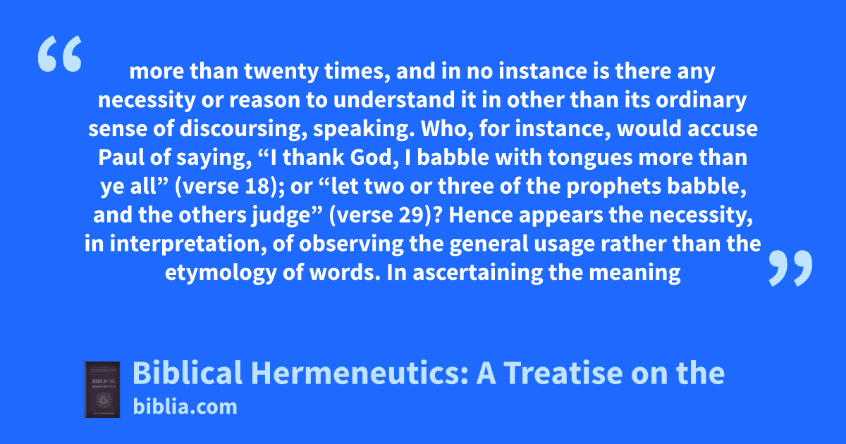 more than twenty times, and in no instance is there any necessity or reason to understand it in other than its ordinary sense of discoursing, speaking. Who, for instance, would accuse Paul of saying, “I thank God, I babble with tongues more than ye all” (verse 18); or “let two or three of the prophets babble, and the others judge” (verse 29)? Hence appears the necessity, in interpretation, of observing the general usage rather than the etymology of words. In ascertaining the meaning
