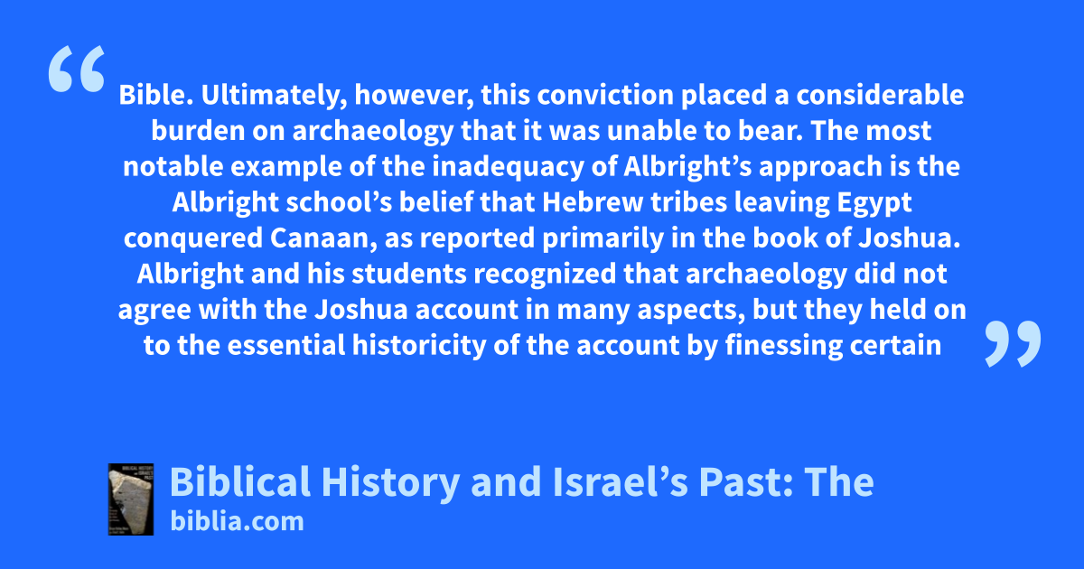 Bible. Ultimately, however, this conviction placed a considerable burden on archaeology that it was unable to bear. The most notable example of the inadequacy of Albright’s approach is the Albright school’s belief that Hebrew tribes leaving Egypt conquered Canaan, as reported primarily in the book of Joshua. Albright and his students recognized that archaeology did not agree with the Joshua account in many aspects, but they held on to the essential historicity of the account by finessing certain