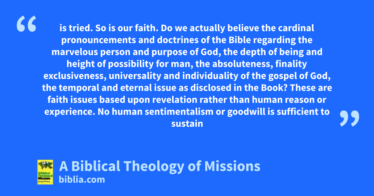 is tried. So is our faith. Do we actually believe the cardinal pronouncements and doctrines of the Bible regarding the marvelous person and purpose of God, the depth of being and height of possibility for man, the absoluteness, finality exclusiveness, universality and individuality of the gospel of God, the temporal and eternal issue as disclosed in the Book? These are faith issues based upon revelation rather than human reason or experience. No human sentimentalism or goodwill is sufficient to sustain
