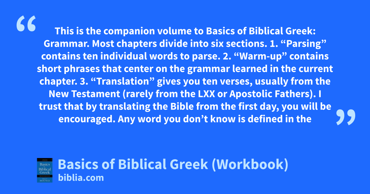 This is the companion volume to Basics of Biblical Greek: Grammar. Most chapters divide into six sections. 1. “Parsing” contains ten individual words to parse. 2. “Warm-up” contains short phrases that center on the grammar learned in the current chapter. 3. “Translation” gives you ten verses, usually from the New Testament (rarely from the LXX or Apostolic Fathers). I trust that by translating the Bible from the first day, you will be encouraged. Any word you don’t know is defined in the