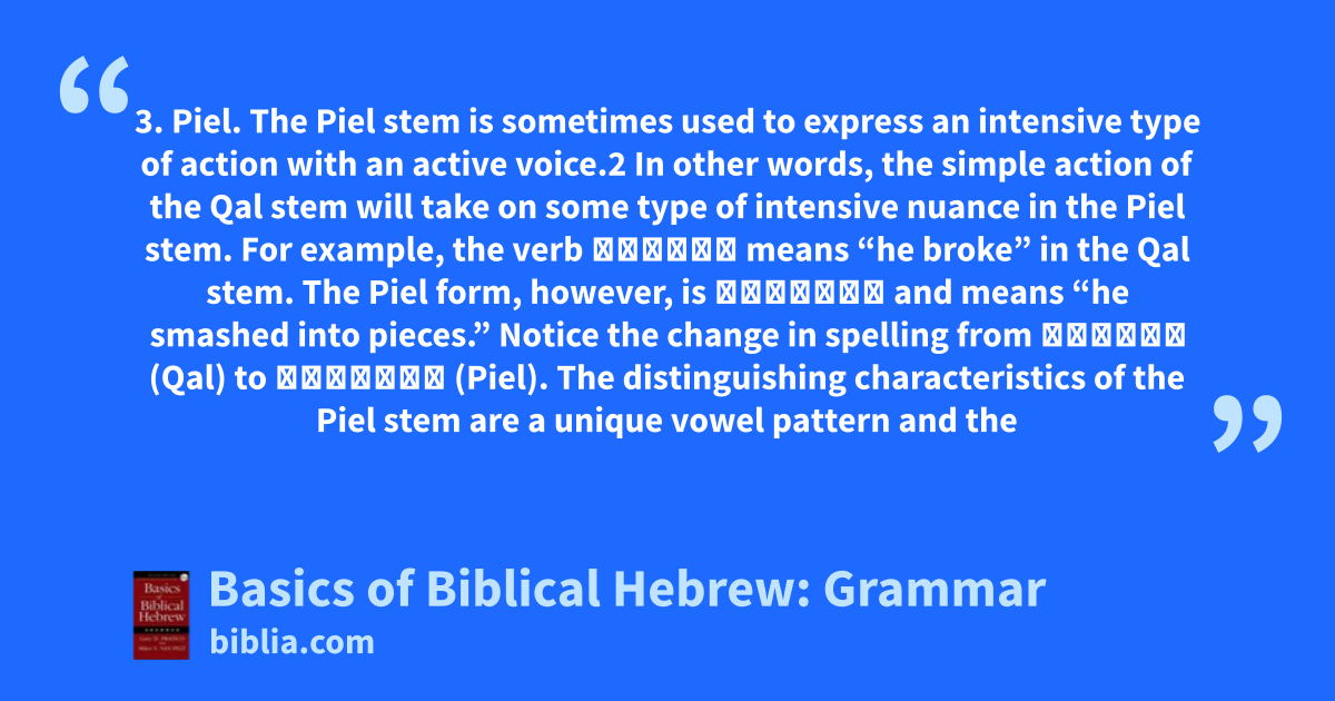 3. Piel. The Piel stem is sometimes used to express an intensive type of action with an active voice.2 In other words, the simple action of the Qal stem will take on some type of intensive nuance in the Piel stem. For example, the verb שָׁבַר means “he broke” in the Qal stem. The Piel form, however, is שִׁבֵּר and means “he smashed into pieces.” Notice the change in spelling from שָׁבַר (Qal) to שִׁבֵּר (Piel). The distinguishing characteristics of the Piel stem are a unique vowel pattern and the