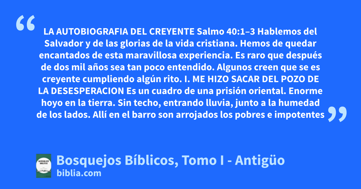 LA AUTOBIOGRAFIA DEL CREYENTE Salmo 40:1–3 Hablemos del Salvador y de las glorias de la vida cristiana. Hemos de quedar encantados de esta maravillosa experiencia. Es raro que después de dos mil años sea tan poco entendido. Algunos creen que se es creyente cumpliendo algún rito. I. ME HIZO SACAR DEL POZO DE LA DESESPERACION Es un cuadro de una prisión oriental. Enorme hoyo en la tierra. Sin techo, entrando lluvia, junto a la humedad de los lados. Allí en el barro son arrojados los pobres e impotentes