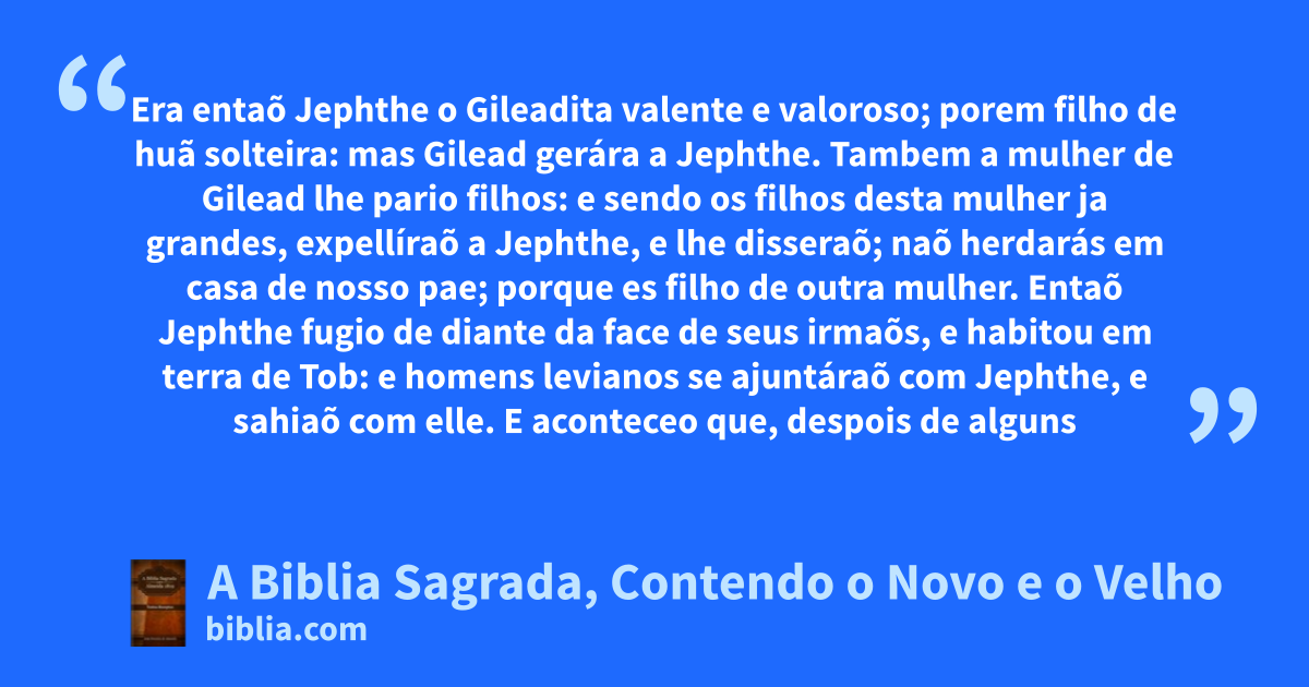 Era entaõ Jephthe o Gileadita valente e valoroso; porem filho de huã solteira: mas Gilead gerára a Jephthe. Tambem a mulher de Gilead lhe pario filhos: e sendo os filhos desta mulher ja grandes, expellíraõ a Jephthe, e lhe disseraõ; naõ herdarás em casa de nosso pae; porque es filho de outra mulher. Entaõ Jephthe fugio de diante da face de seus irmaõs, e habitou em terra de Tob: e homens levianos se ajuntáraõ com Jephthe, e sahiaõ com elle. E aconteceo que, despois de alguns