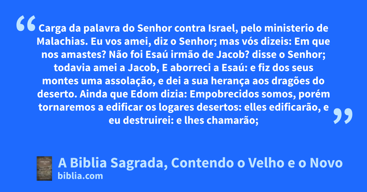 Carga da palavra do Senhor contra Israel, pelo ministerio de Malachias. Eu vos amei, diz o Senhor; mas vós dizeis: Em que nos amastes? Não foi Esaú irmão de Jacob? disse o Senhor; todavia amei a Jacob, E aborreci a Esaú: e fiz dos seus montes uma assolação, e dei a sua herança aos dragões do deserto. Ainda que Edom dizia: Empobrecidos somos, porém tornaremos a edificar os logares desertos: elles edificarão, e eu destruirei: e lhes chamarão;