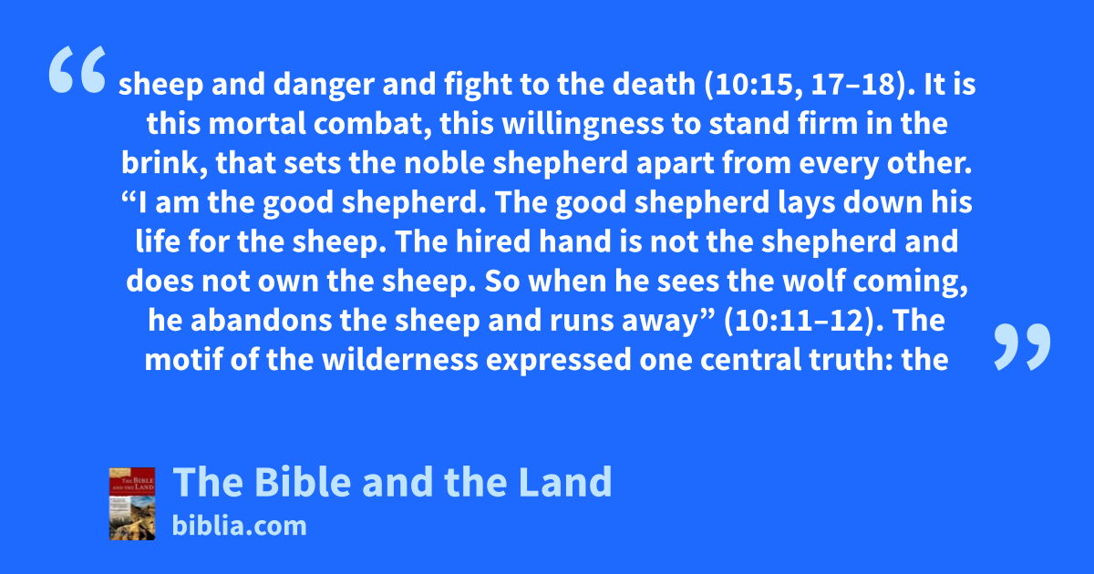 sheep and danger and fight to the death (10:15, 17–18). It is this mortal combat, this willingness to stand firm in the brink, that sets the noble shepherd apart from every other. “I am the good shepherd. The good shepherd lays down his life for the sheep. The hired hand is not the shepherd and does not own the sheep. So when he sees the wolf coming, he abandons the sheep and runs away” (10:11–12). The motif of the wilderness expressed one central truth: the
