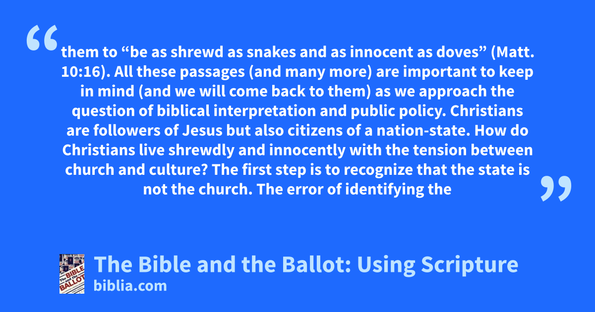 them to “be as shrewd as snakes and as innocent as doves” (Matt. 10:16). All these passages (and many more) are important to keep in mind (and we will come back to them) as we approach the question of biblical interpretation and public policy. Christians are followers of Jesus but also citizens of a nation-state. How do Christians live shrewdly and innocently with the tension between church and culture? The first step is to recognize that the state is not the church. The error of identifying the
