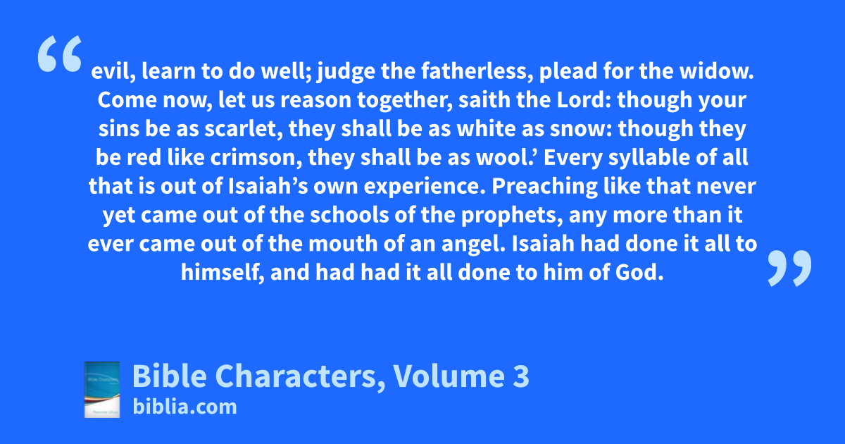 evil, learn to do well; judge the fatherless, plead for the widow. Come now, let us reason together, saith the Lord: though your sins be as scarlet, they shall be as white as snow: though they be red like crimson, they shall be as wool.’ Every syllable of all that is out of Isaiah’s own experience. Preaching like that never yet came out of the schools of the prophets, any more than it ever came out of the mouth of an angel. Isaiah had done it all to himself, and had had it all done to him of God.