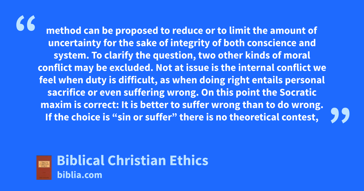 method can be proposed to reduce or to limit the amount of uncertainty for the sake of integrity of both conscience and system. To clarify the question, two other kinds of moral conflict may be excluded. Not at issue is the internal conflict we feel when duty is difficult, as when doing right entails personal sacrifice or even suffering wrong. On this point the Socratic maxim is correct: It is better to suffer wrong than to do wrong. If the choice is “sin or suffer” there is no theoretical contest,