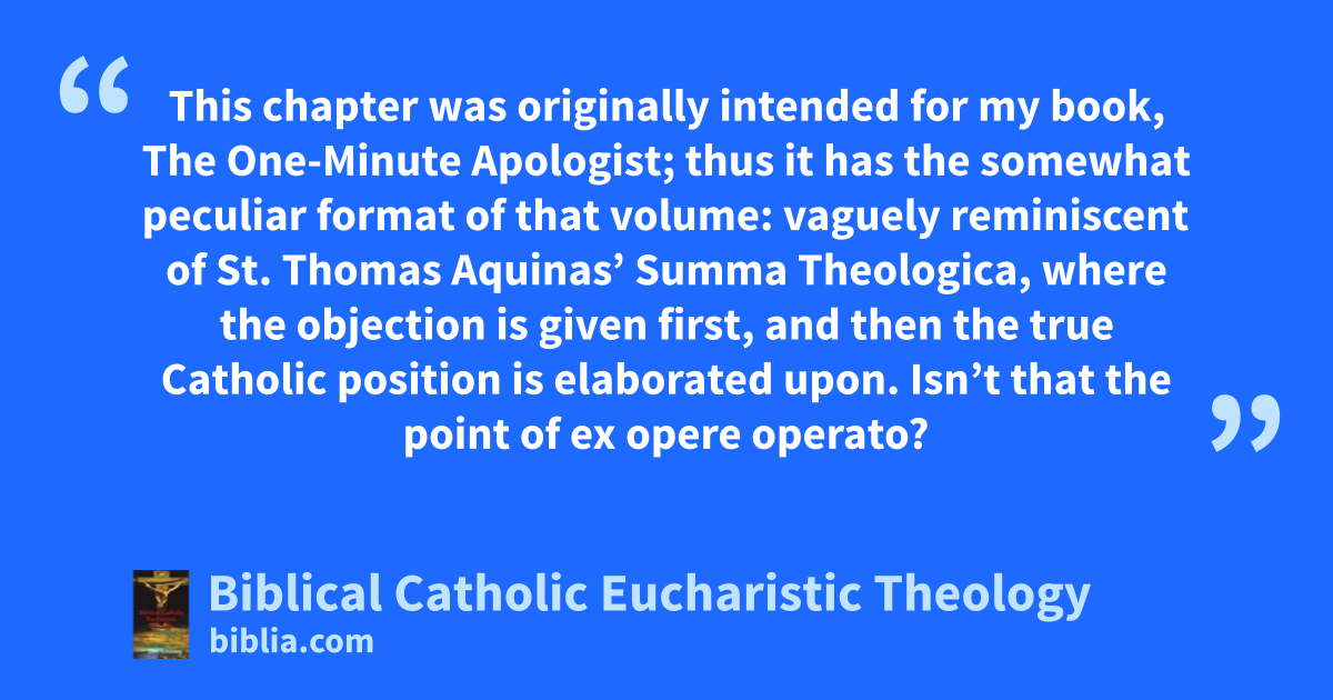 This chapter was originally intended for my book, The One-Minute Apologist; thus it has the somewhat peculiar format of that volume: vaguely reminiscent of St. Thomas Aquinas’ Summa Theologica, where the objection is given first, and then the true Catholic position is elaborated upon. Isn’t that the point of ex opere operato?