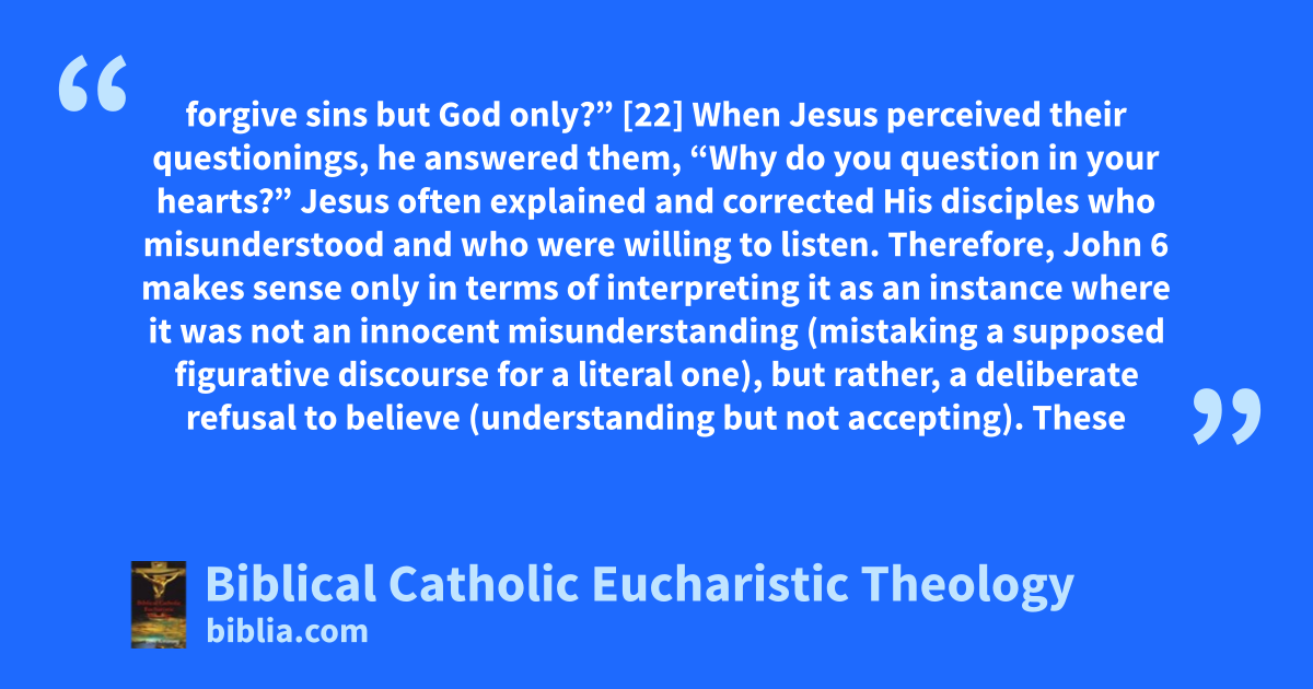 forgive sins but God only?” [22] When Jesus perceived their questionings, he answered them, “Why do you question in your hearts?” Jesus often explained and corrected His disciples who misunderstood and who were willing to listen. Therefore, John 6 makes sense only in terms of interpreting it as an instance where it was not an innocent misunderstanding (mistaking a supposed figurative discourse for a literal one), but rather, a deliberate refusal to believe (understanding but not accepting). These