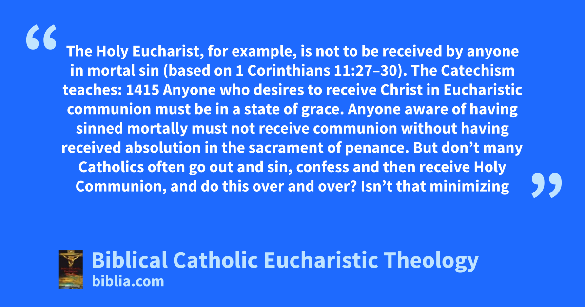 The Holy Eucharist, for example, is not to be received by anyone in mortal sin (based on 1 Corinthians 11:27–30). The Catechism teaches: 1415 Anyone who desires to receive Christ in Eucharistic communion must be in a state of grace. Anyone aware of having sinned mortally must not receive communion without having received absolution in the sacrament of penance. But don’t many Catholics often go out and sin, confess and then receive Holy Communion, and do this over and over? Isn’t that minimizing