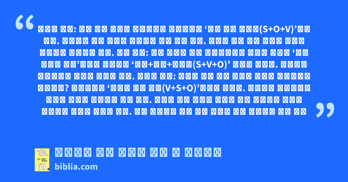 우리말 순서: 나는 밥을 먹었다 일반적으로 우리나라는 ‘나는 밥을 먹었다(S+O+V)’라고 한다. 그러므로 왼쪽 그림의 순서대로 보게 되어 있다. 그렇다 보니 누가 무엇을 어떻게 했느냐에 중요도를 둔다. 영어 순서: 나는 먹었다 밥을 인도유러피언 언어인 영어는 ‘나는 먹었다 밥을’이라고 말하면서 ‘주어+동사+목적어(S+V+O)’ 순으로 말한다. 그러므로 목적보다는 행동에 초점을 둔다. 히브리 순서: 먹었다 나는 밥을 우리가 배우는 히브리어는 어떠한가? 히브리어는 ‘먹었다 나는 밥을(V+S+O)’이라고 말한다. 그러므로 히브리어는 행동인 동사에 강조점을 두고 있다. 그렇다 보니 동사의 변화가 많고 행동으로 그들의 진정성을 보이는 경향이 있다. 중동 지역에서 자살 폭탄 테러가 자주 일어나는 것도 이와