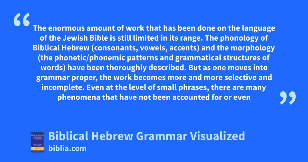 In Biblical Hebrew Grammar Visualized, Francis Andersen and A. Dean Forbes approach the grammar of biblical Hebrew from the perspective of corpus linguistics. Their pictorial representations of the clauses making up the biblical texts show the grammatical functions and semantic roles of clausal constituents, as well as the grammatical relations that bind the constituents into coherent structures....