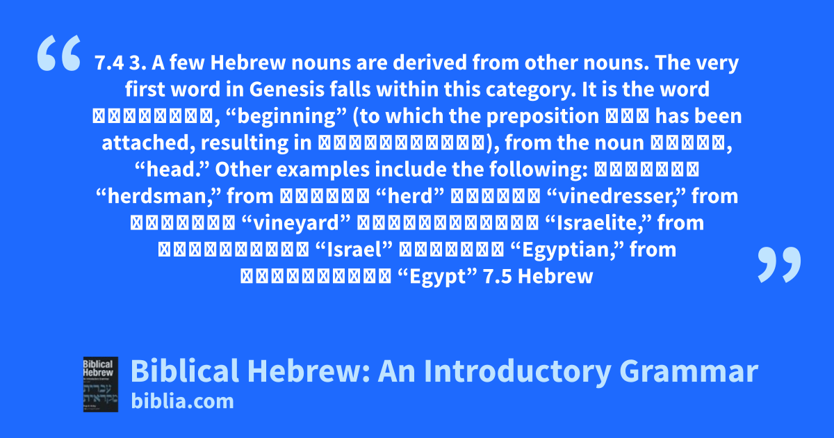 7.4 3. A few Hebrew nouns are derived from other nouns. The very first word in Genesis falls within this category. It is the word רֵאשִׁית, “beginning” (to which the preposition בְּ has been attached, resulting in בְּרֵאשִׁית), from the noun רֹאשׁ, “head.” Other examples include the following: בּוֹקֵר “herdsman,” from בָּקָר “herd” כֹּרֵם “vinedresser,” from כֶּ֣רֶם “vineyard” יִשְׂרְאֵלִי “Israelite,” from יִשְׂרָאֵל “Israel” מִצְרִי “Egyptian,” from מִצְרַ֣יִם “Egypt” 7.5 Hebrew