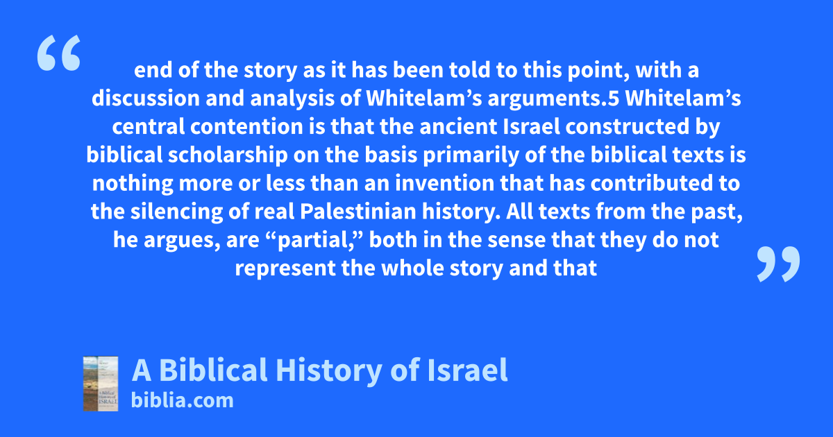 end of the story as it has been told to this point, with a discussion and analysis of Whitelam’s arguments.5 Whitelam’s central contention is that the ancient Israel constructed by biblical scholarship on the basis primarily of the biblical texts is nothing more or less than an invention that has contributed to the silencing of real Palestinian history. All texts from the past, he argues, are “partial,” both in the sense that they do not represent the whole story and that