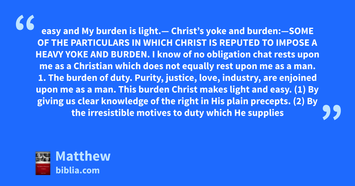 easy and My burden is light.— Christ’s yoke and burden:—SOME OF THE PARTICULARS IN WHICH CHRIST IS REPUTED TO IMPOSE A HEAVY YOKE AND BURDEN. I know of no obligation chat rests upon me as a Christian which does not equally rest upon me as a man. 1. The burden of duty. Purity, justice, love, industry, are enjoined upon me as a man. This burden Christ makes light and easy. (1) By giving us clear knowledge of the right in His plain precepts. (2) By the irresistible motives to duty which He supplies