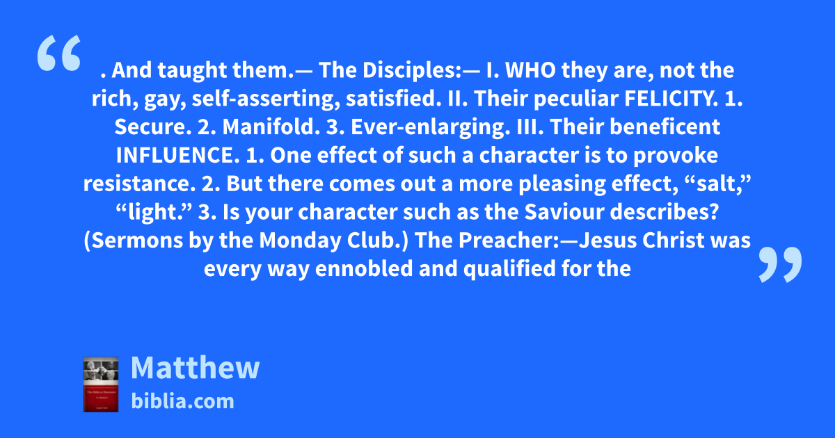 . And taught them.— The Disciples:— I. WHO they are, not the rich, gay, self-asserting, satisfied. II. Their peculiar FELICITY. 1. Secure. 2. Manifold. 3. Ever-enlarging. III. Their beneficent INFLUENCE. 1. One effect of such a character is to provoke resistance. 2. But there comes out a more pleasing effect, “salt,” “light.” 3. Is your character such as the Saviour describes? (Sermons by the Monday Club.) The Preacher:—Jesus Christ was every way ennobled and qualified for the