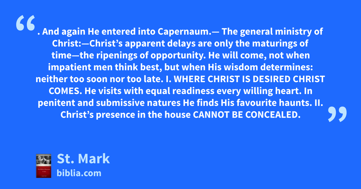 . And again He entered into Capernaum.— The general ministry of Christ:—Christ’s apparent delays are only the maturings of time—the ripenings of opportunity. He will come, not when impatient men think best, but when His wisdom determines: neither too soon nor too late. I. WHERE CHRIST IS DESIRED CHRIST COMES. He visits with equal readiness every willing heart. In penitent and submissive natures He finds His favourite haunts. II. Christ’s presence in the house CANNOT BE CONCEALED.