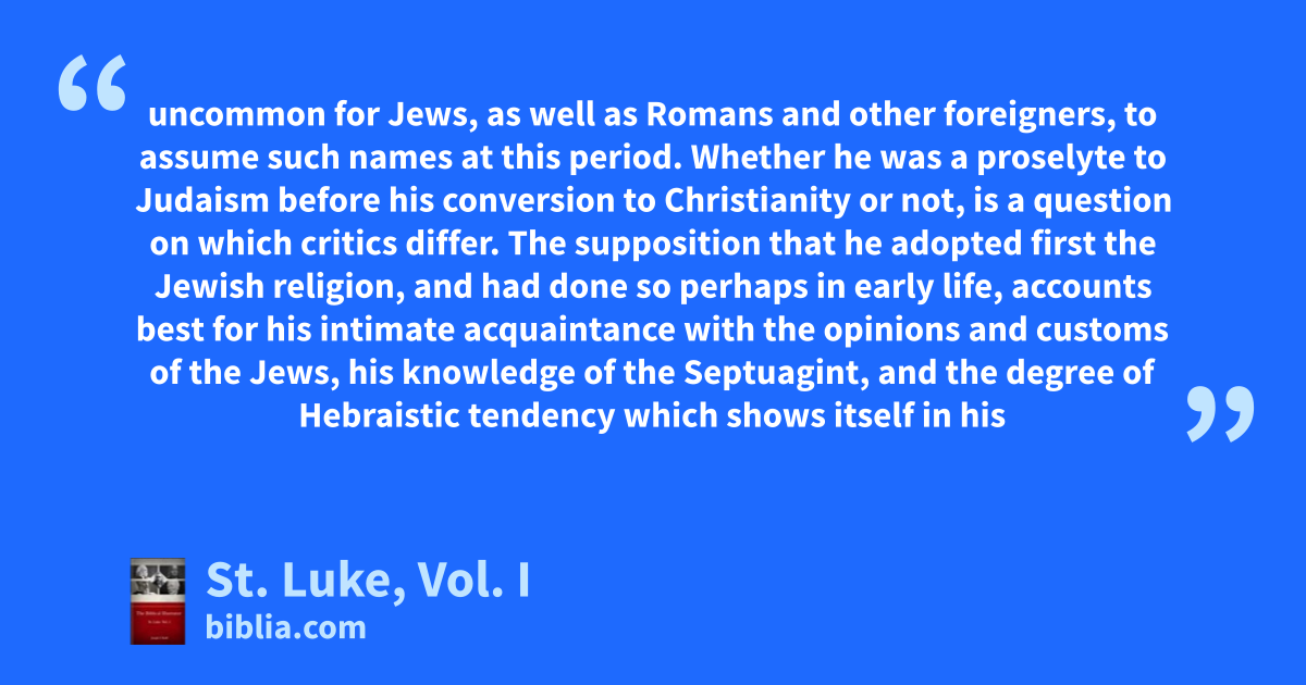 uncommon for Jews, as well as Romans and other foreigners, to assume such names at this period. Whether he was a proselyte to Judaism before his conversion to Christianity or not, is a question on which critics differ. The supposition that he adopted first the Jewish religion, and had done so perhaps in early life, accounts best for his intimate acquaintance with the opinions and customs of the Jews, his knowledge of the Septuagint, and the degree of Hebraistic tendency which shows itself in his