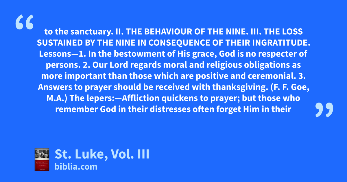 to the sanctuary. II. THE BEHAVIOUR OF THE NINE. III. THE LOSS SUSTAINED BY THE NINE IN CONSEQUENCE OF THEIR INGRATITUDE. Lessons—1. In the bestowment of His grace, God is no respecter of persons. 2. Our Lord regards moral and religious obligations as more important than those which are positive and ceremonial. 3. Answers to prayer should be received with thanksgiving. (F. F. Goe, M.A.) The lepers:—Affliction quickens to prayer; but those who remember God in their distresses often forget Him in their