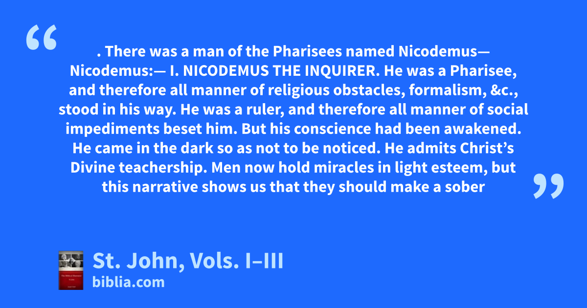 . There was a man of the Pharisees named Nicodemus— Nicodemus:— I. NICODEMUS THE INQUIRER. He was a Pharisee, and therefore all manner of religious obstacles, formalism, &c., stood in his way. He was a ruler, and therefore all manner of social impediments beset him. But his conscience had been awakened. He came in the dark so as not to be noticed. He admits Christ’s Divine teachership. Men now hold miracles in light esteem, but this narrative shows us that they should make a sober