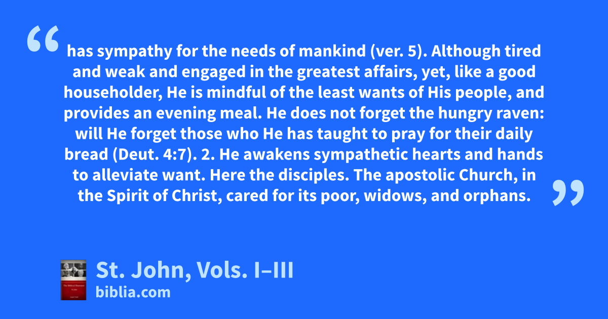 has sympathy for the needs of mankind (ver. 5). Although tired and weak and engaged in the greatest affairs, yet, like a good householder, He is mindful of the least wants of His people, and provides an evening meal. He does not forget the hungry raven: will He forget those who He has taught to pray for their daily bread (Deut. 4:7). 2. He awakens sympathetic hearts and hands to alleviate want. Here the disciples. The apostolic Church, in the Spirit of Christ, cared for its poor, widows, and orphans.